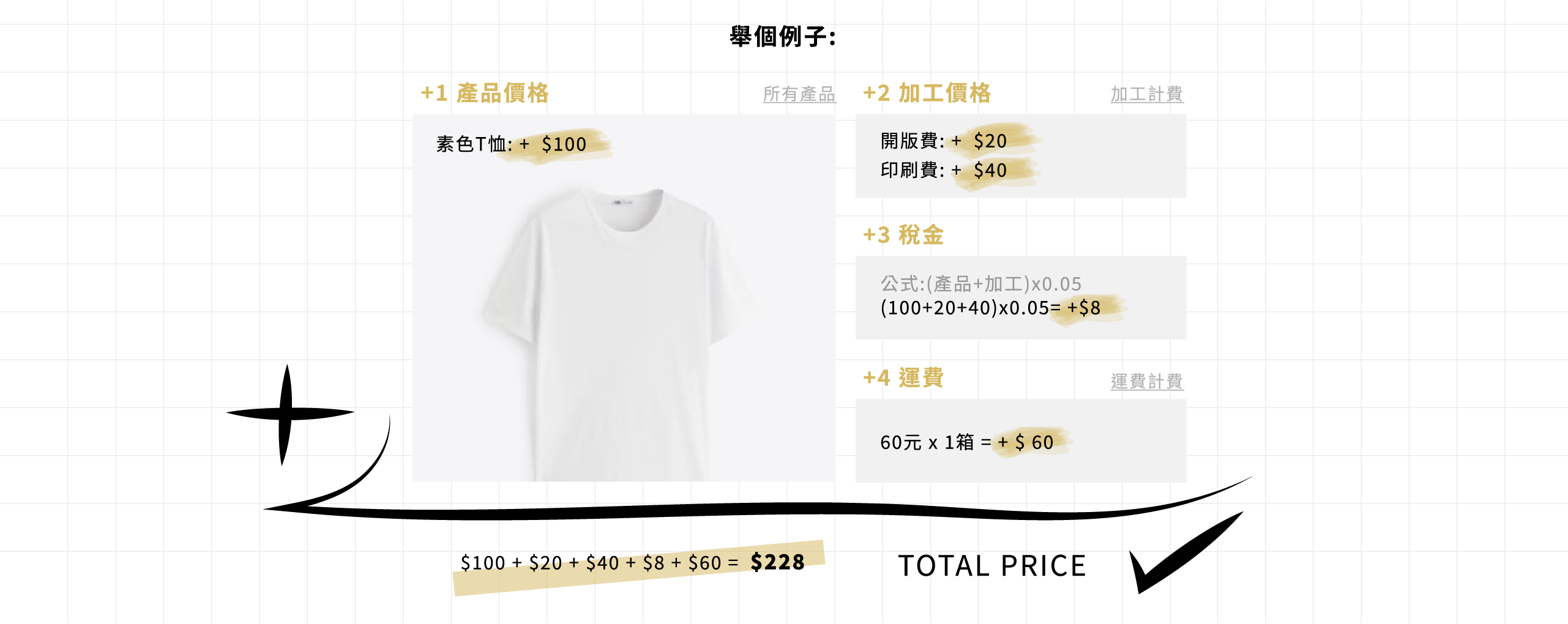 訂單費用=產品本身+加工費用+稅金+運費